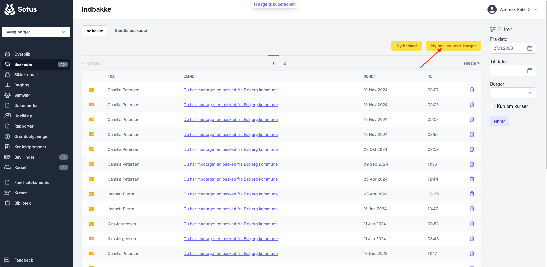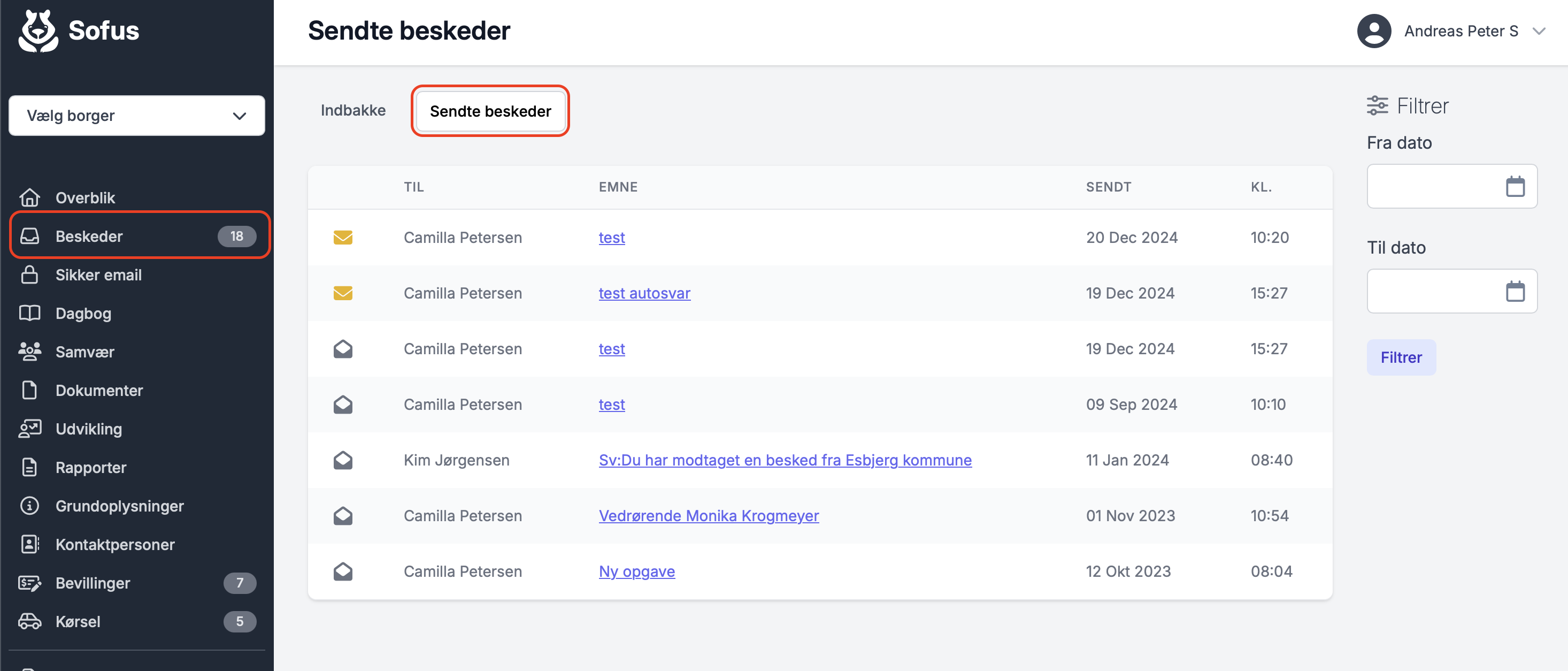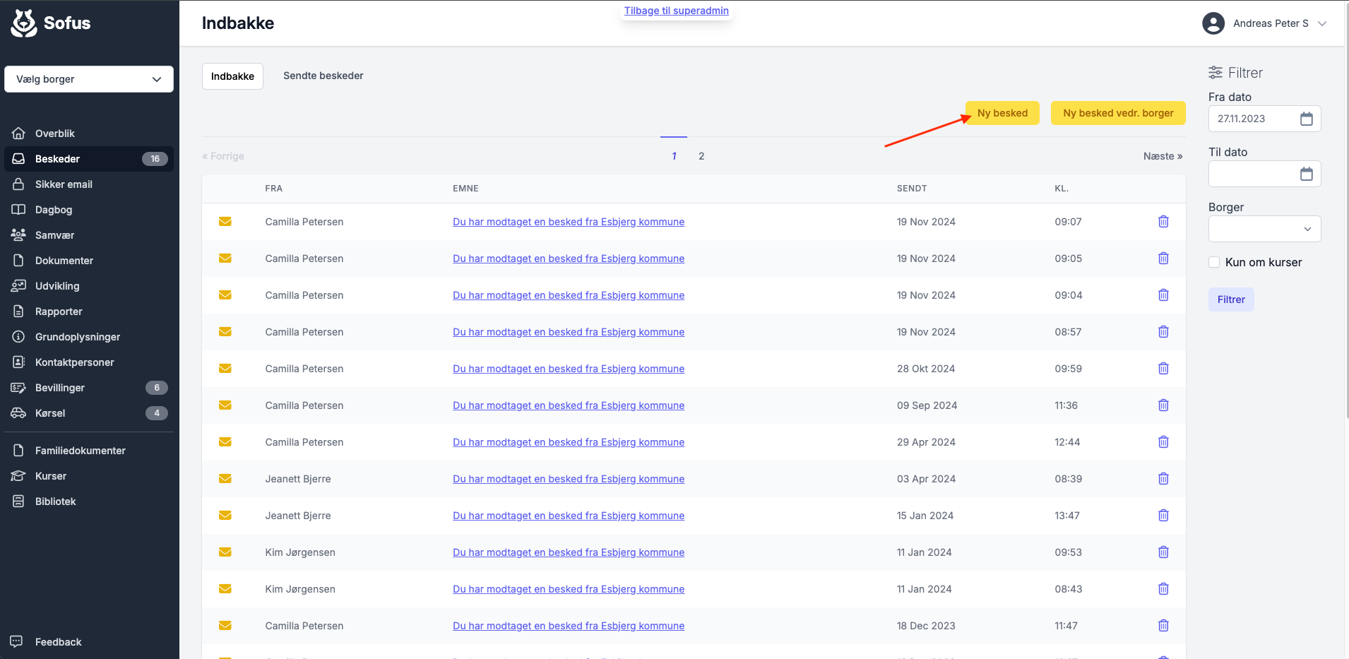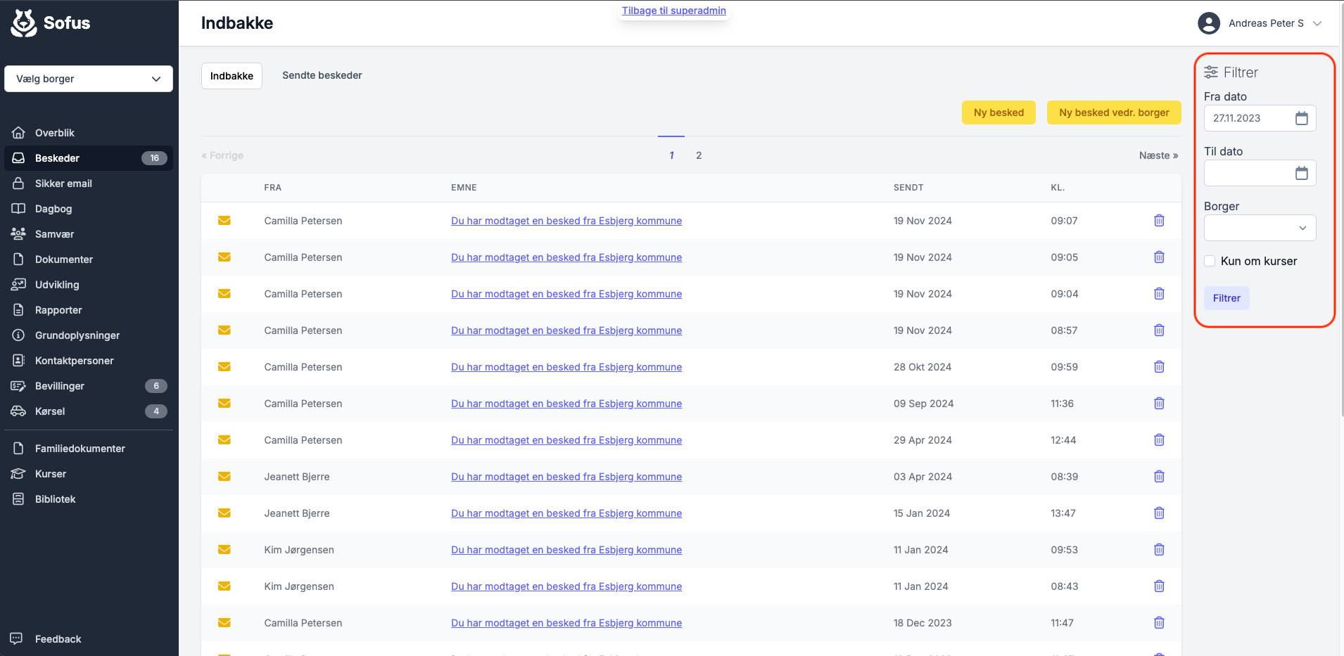Som standard er filtreringen sat til at vise beskeder fra dags dato og et år tilbage. Oplever du en notifikation om ny besked, som du ikke kan se, så kan det skyldes, at der ligger en besked, som er mere end et år gammel.