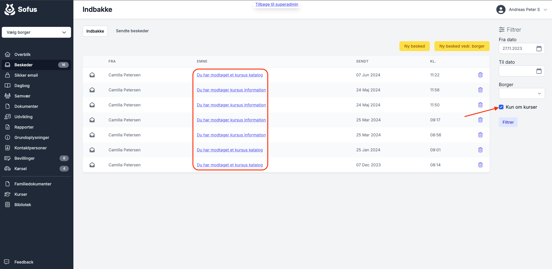 Du kan med fordel filtrere efter kursus ved at vinge af i Kun i kurser.