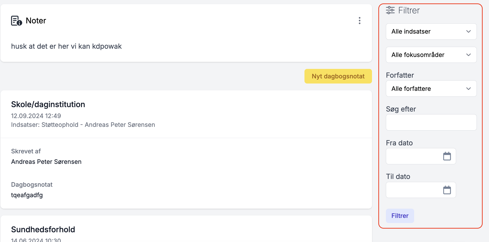 I menuen til højre kan du filtrere i de forskellige fokusområder. Hvis du oplever at "mangle" nogle dagbogsnotater, så kan der være filtreret på eksempelvis indsatser, så ikke alle notater vises. Filtrer blot til at vise alle indsatser eller den ønskede indsats for korrekt visning.