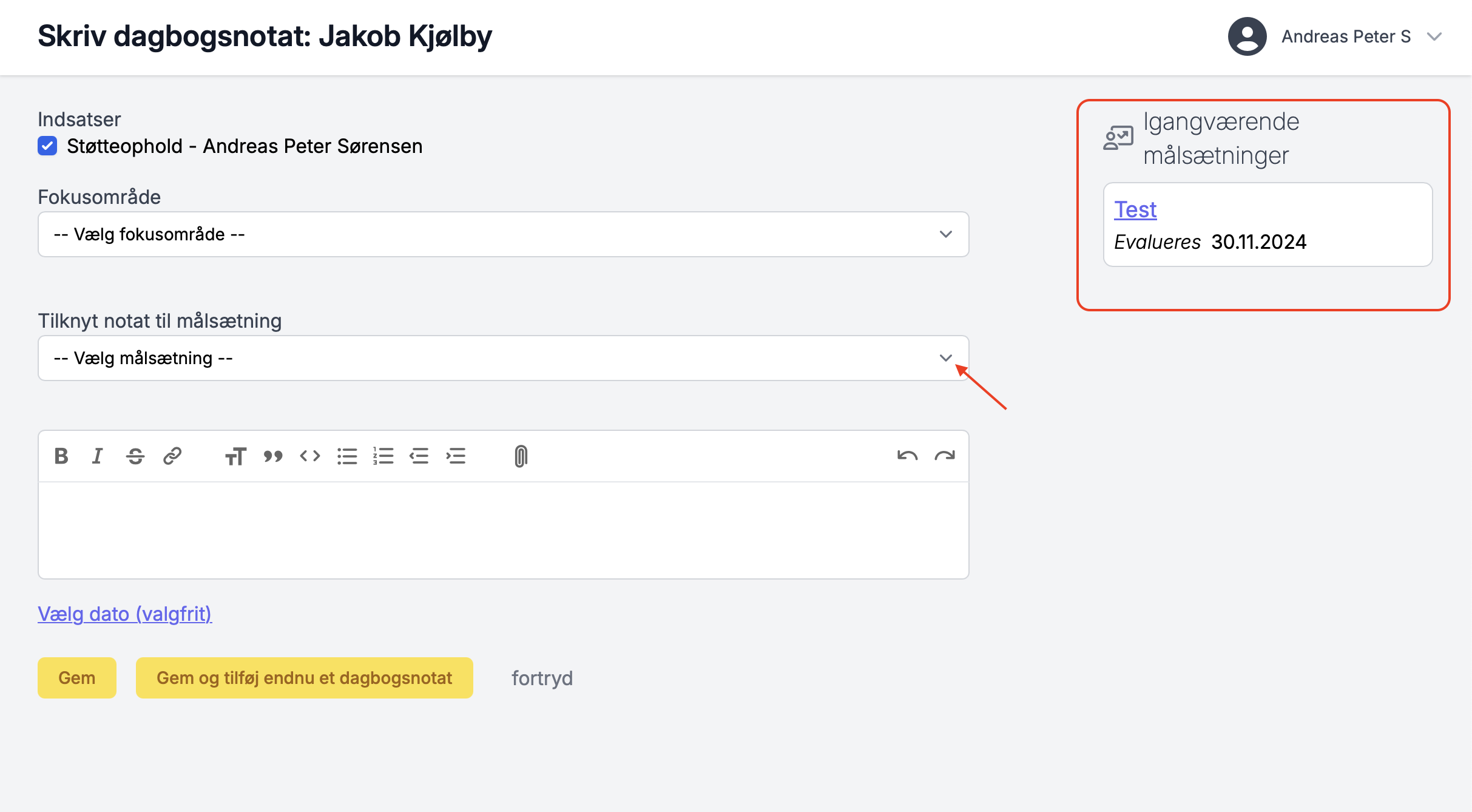 Brug dropdownmenuen under Tilknyt notat til målsætning og tryk gem.