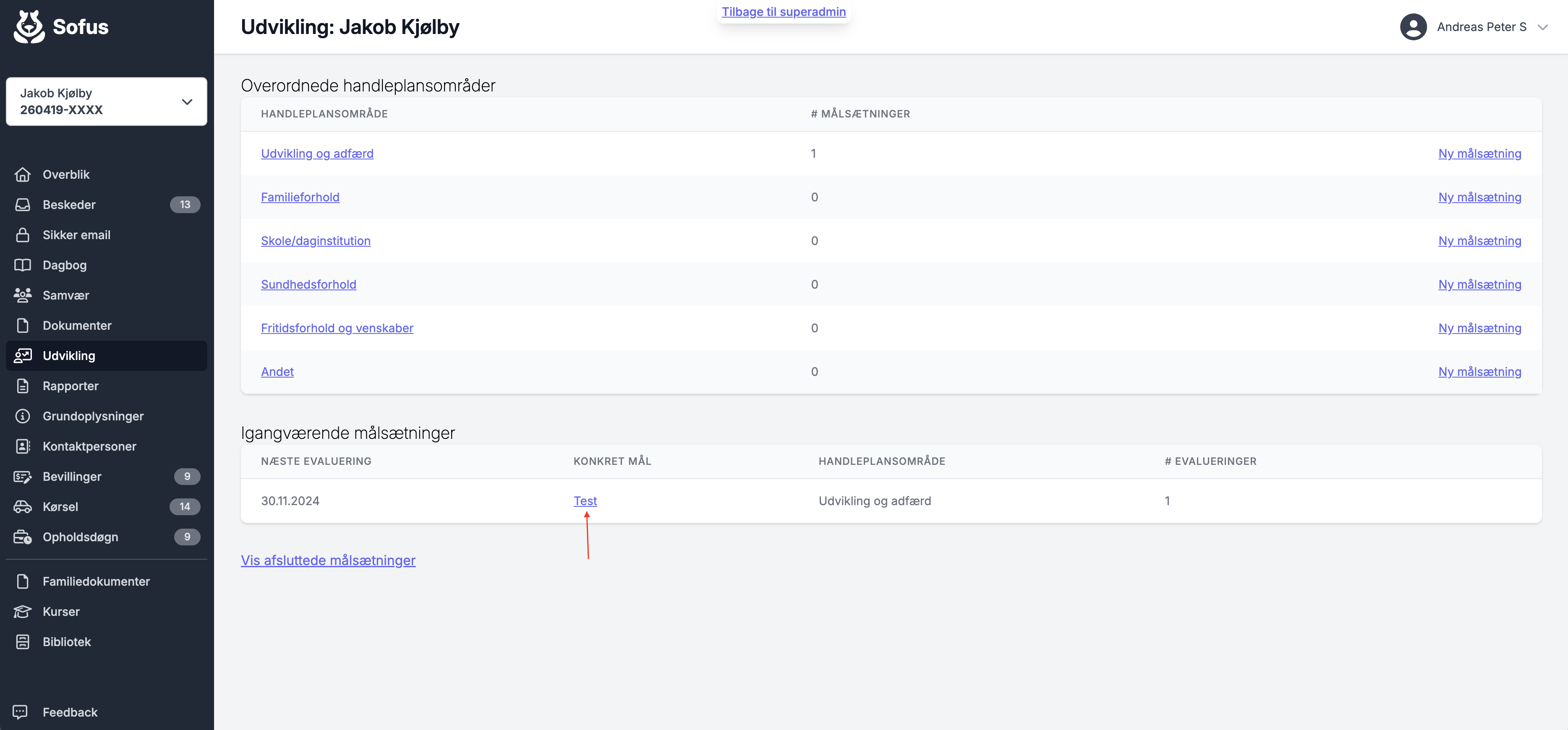Her ser du de forskellige handleplansområder, der arbejdes med. Under MÅLSÆTNINGER kan du se hvor mange målsætninger, der er igang.
