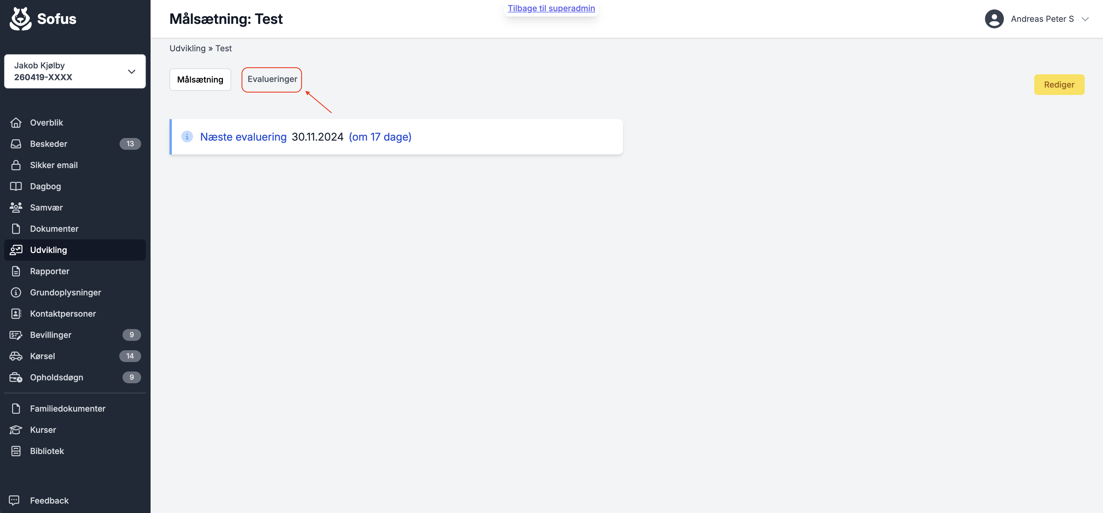 Når det er tid til at evaluere, så går du ind på på den igangværende målsætning og trykker på den blå tekst under KONKRET MÅL.